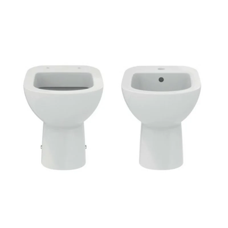 Il set sanitari I.Life A è in ceramica con finitura bianco lucido;comprende il wc con brida e sistema di scarico a terra,bidet completo di foro per miscelatore e troppo pieno e copriwater originale Ideal Standard,modello avvolgente,con cerniere in metallo e chiusura standard.
