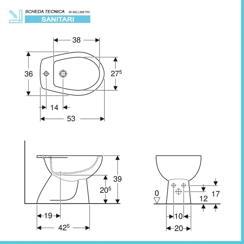 • Dimensioni bidet:L 36 x p 53 x H 39 cm;