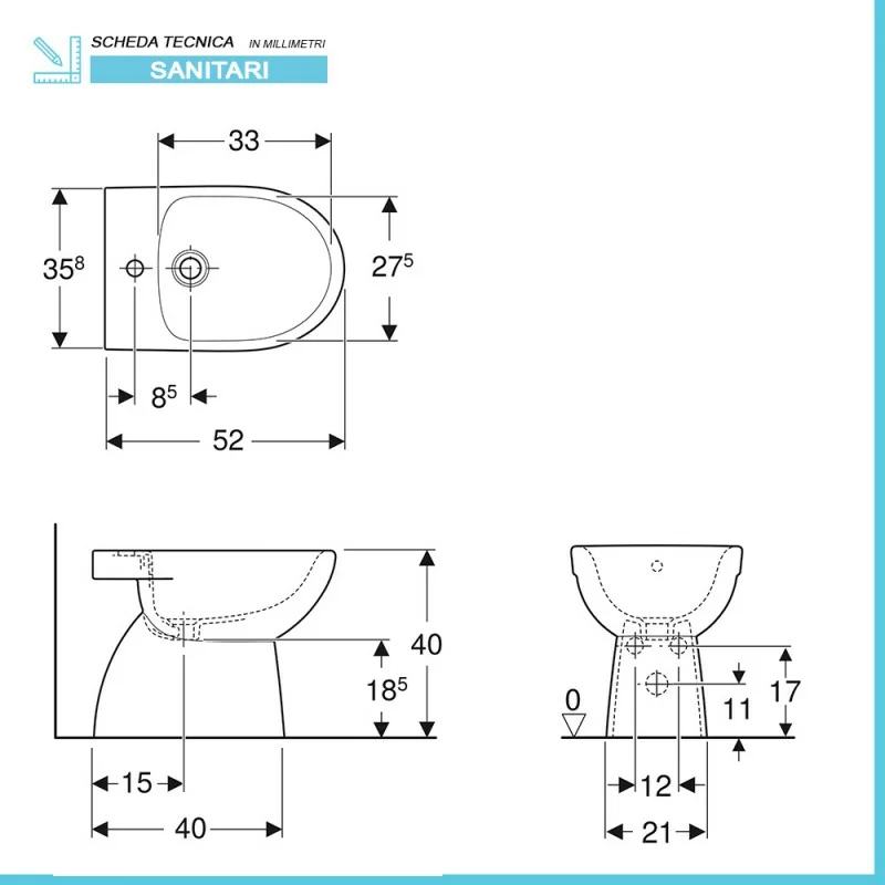 • Dimensioni bidet:L 35,8 x p 52 x H 40 cm;