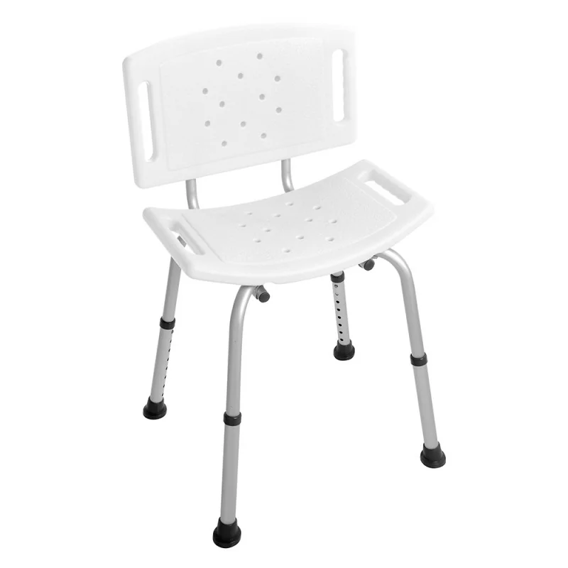Sedia doccia bianca con schienale regolabile in altezza e piedi antiscivolo Sedia doccia bianca con schienale regolabile in altezza e piedi antiscivolo