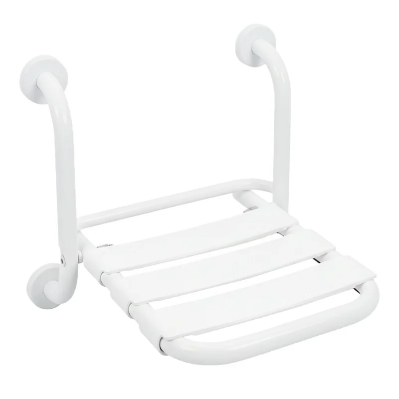 Sedile ribaltabile per disabili verniciato bianco, resistente, sicuro e facile da pulire. Ideale per docce accessibili, con struttura robusta e design ergonomico.
