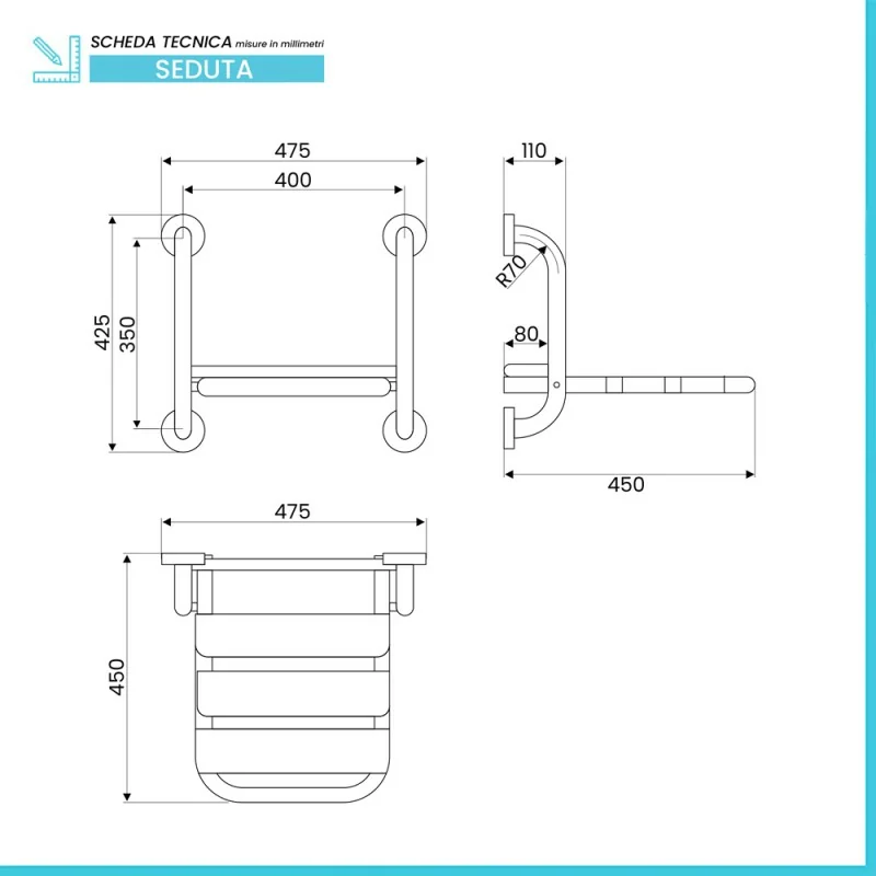 La struttura verniciata ad alta resistenza assicura lunga durata, protezione dalla corrosione e totale sicurezza d’uso, mentre il meccanismo ribaltabile permette di richiudere la seduta verso la parete quando non utilizzata, ottimizzando lo spazio e mantenendo l’ambiente ordinato.