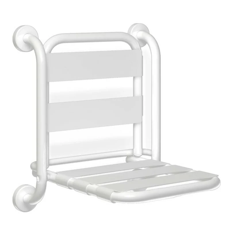 Sedile ribaltabile con schienale per disabili verniciato bianco, resistente, sicuro e facile da pulire. Ideale per docce accessibili, con struttura robusta e design ergonomico.