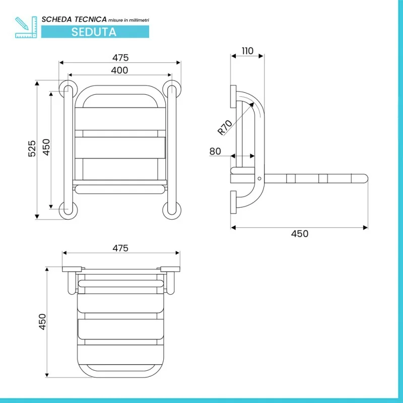 La struttura verniciata ad alta resistenza assicura lunga durata, protezione dalla corrosione e totale sicurezza d’uso, mentre il meccanismo ribaltabile permette di richiudere la seduta verso la parete quando non utilizzata, ottimizzando lo spazio e mantenendo l’ambiente ordinato.