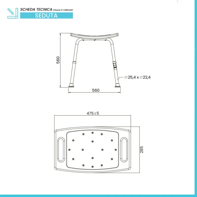 Lo sgabello doccia proposto è realizzata in alluminio solido, installato direttamente in appoggio al pavimento con piedi antiscivolo e portata massima fino a 110 kg. La seduta è regolabile in altezza, con dimensioni che variano dai 34 ai 51 cm.