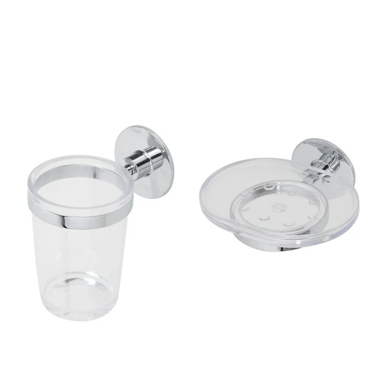 Il set Idea è composto da 2 accessori bagno in acciaio cromato,con un comodo fissaggio a muro,sia con viti che biadesivo. Include bicchiere portaspazzolino e portasapone;completano la serie altri accessori a muro proposti in set.