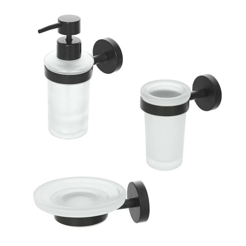 Il set Chic Black è composto da 3 accessori bagno in acciaio,con un comodo fissaggio a muro compreso di viti. Include dispenser portasapone,bicchiere portaspazzolini e piattino porta sapone.