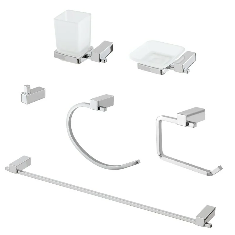 • Set:portaspazzolini,portasapone,portarotolo,appendino e portasciugamani ad anello;