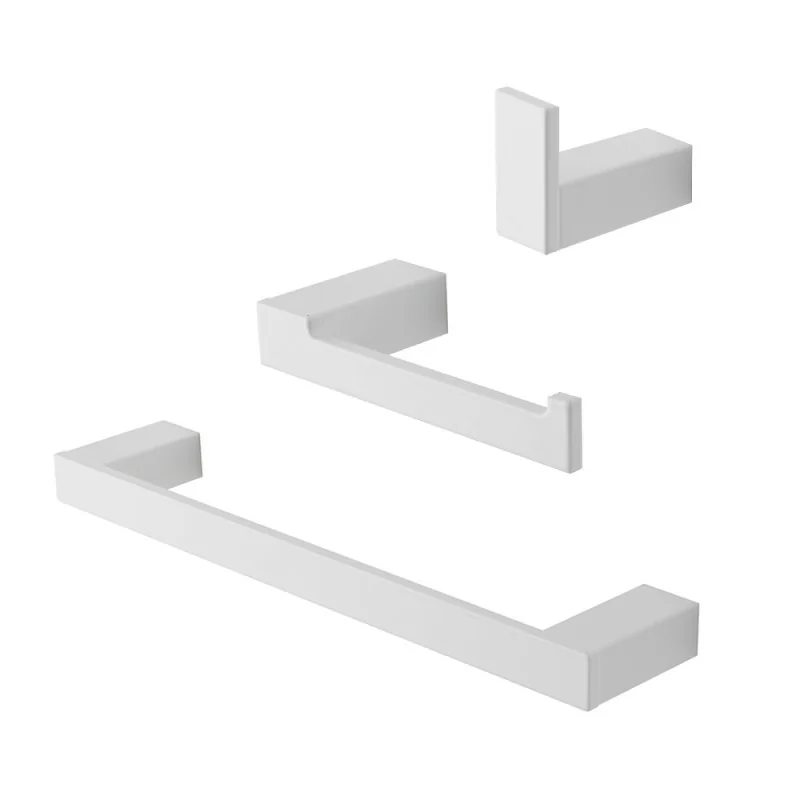 Questo set  in alluminio bianco offre una soluzione robusta ed elegante per organizzare asciugamani, accappatoi e carta igienica  grazie al sicuro fissaggio a parete con viti e tasselli inclusi. Il materiale in alluminio garantisce durabilità e un aspetto moderno.