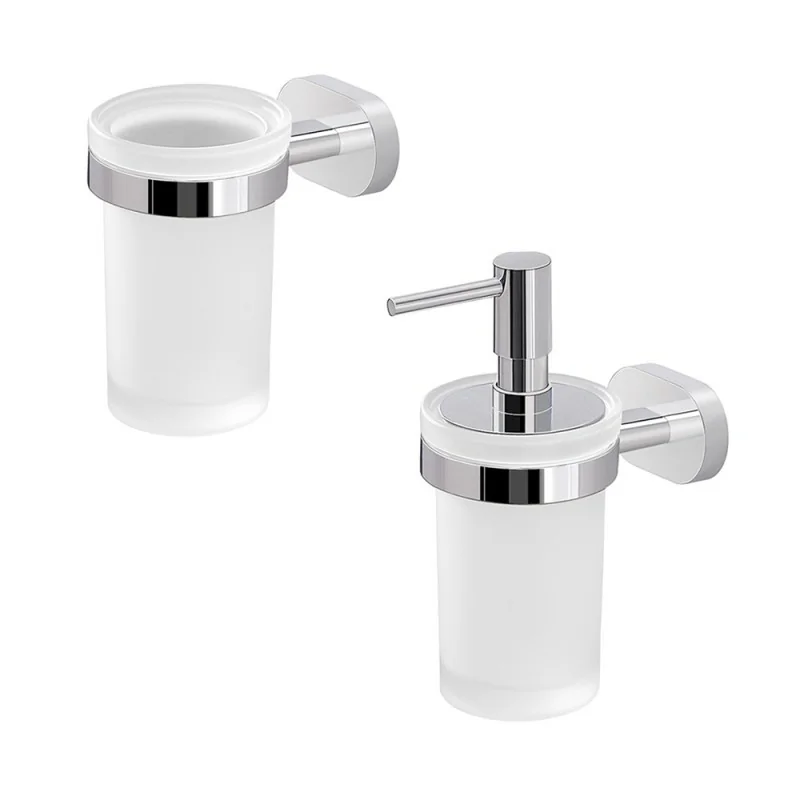 Kit bagno 2 pezzi con dosa sapone liquido e bicchiere porta spazzolino con fissaggio a muro Bernina