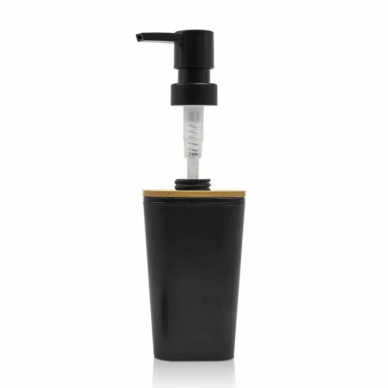 Set accessori bagno moderno in finitura nera opaca con dettagli in bambù Scheda tecnica dispenser sapone nero opaco con dettagli in bamboo Scheda tecnica bicchiere portaspazzolini in finitura nero opaco con dettagli in bamboo Scheda tecnica portascopino in finitura nera opaca con dettagli in bambù Scheda tecnica porta saponetta in finitura nera opaca con dettagli in bamboo Porta sapone nero opaco con dettagli in legno di bambù Portascopino wc da appoggio in finitura nera opaca con dettagli in bamboo Diffusore sapone con erogatore a pompa estraibile in plastica nera opaca con dettagli in bamboo