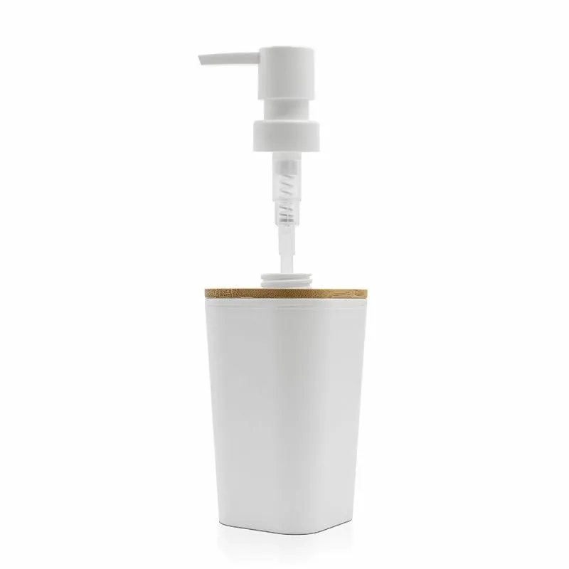 Kit bagno completo con dispenser sapone,porta spazzolini,porta scopino e porta saponetta in finitura bianca opaca con dettagli in bambù...