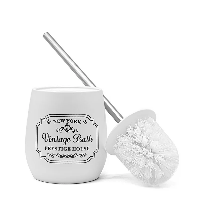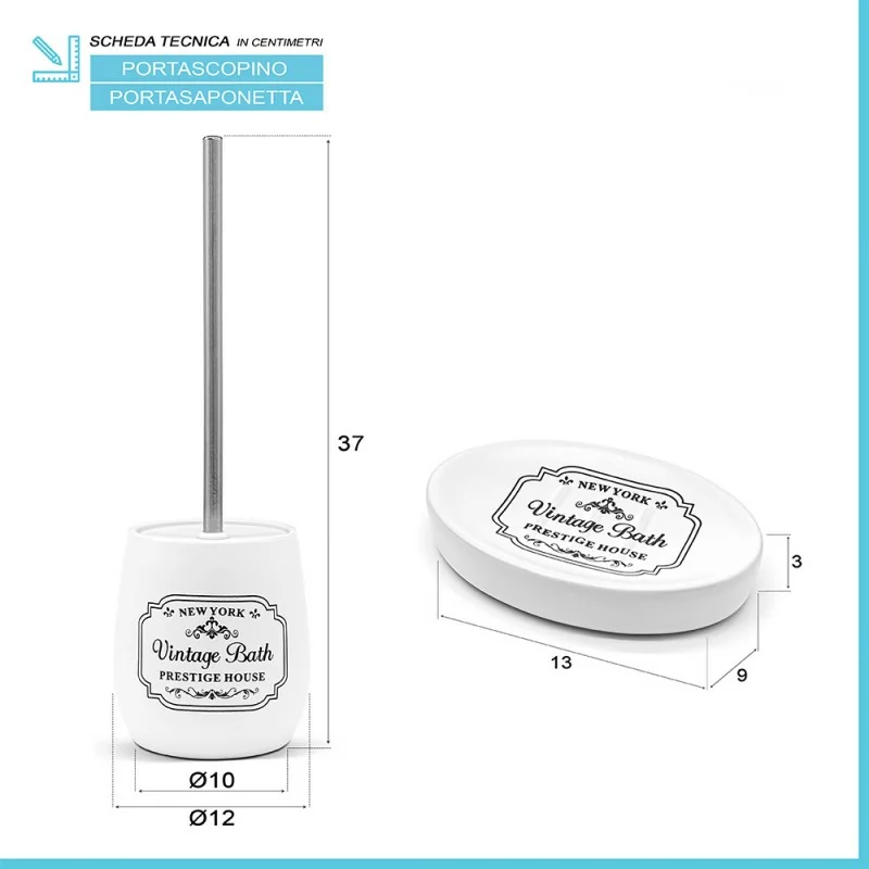 Set bagno completo con 4 pezzi in ceramica bianca con stampe nere vintage Scheda tecnica dispenser sapone e portaspazzolini in ceramica bianca con stampe nere vintage Scheda tecnica portascopino e portasaponetta in ceramica bianca con stampe nere vintage Dispenser sapone liquido in ceramica bianca con stampe a contrasto nere vintage Portascopino wc in ceramica bianca con stampe nere vintage Portaspazzolino a bicchiere in ceramica bianca con stampe nere vintage Portasapone solido in ceramica bianca con stampe nere vintage Set da bagno completo con 4 pezzi in ceramica bianca con stampe nere vintage