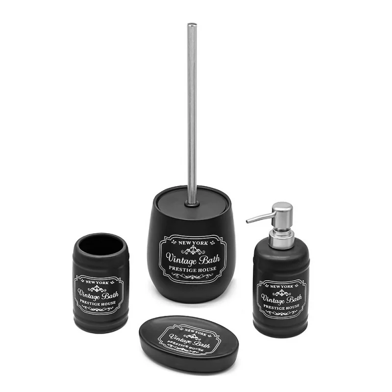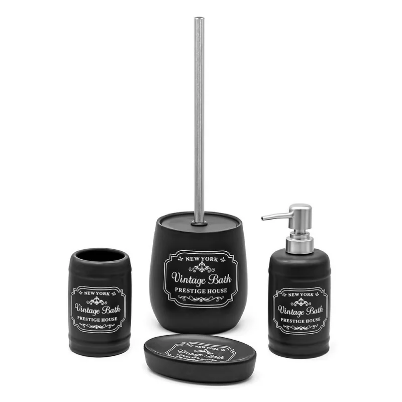 Set bagno completo con 4 pezzi in ceramica nera con stampe bianche vintage