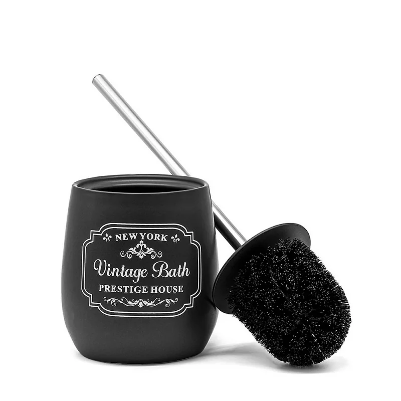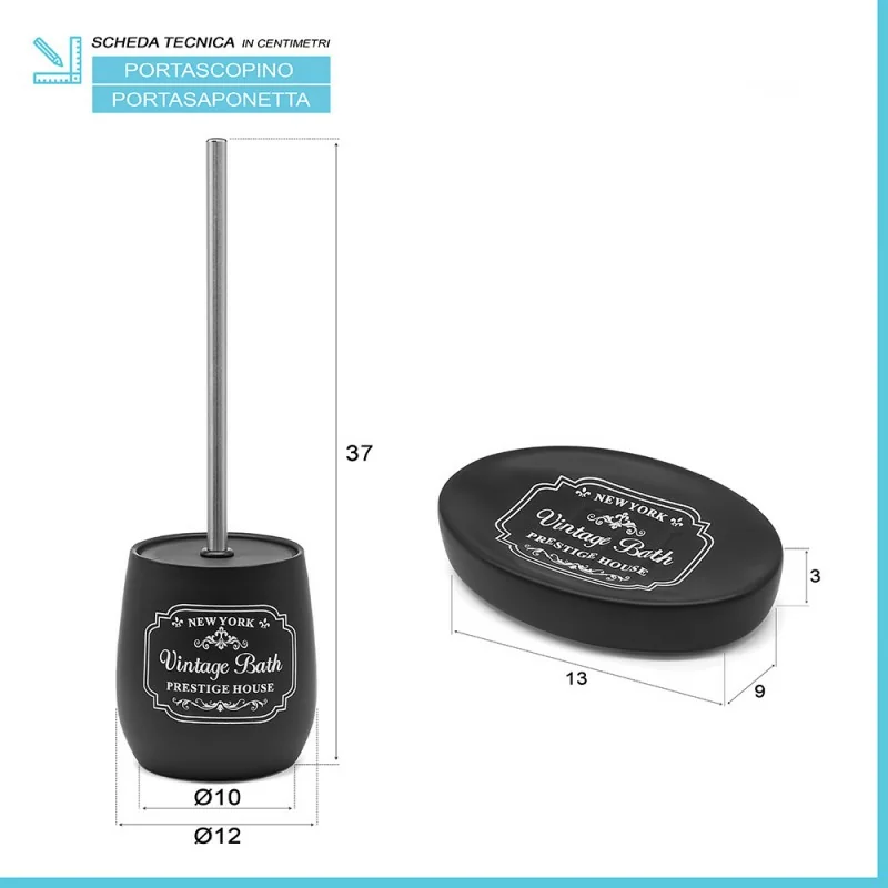 Set bagno completo con 4 pezzi in ceramica nera con stampe bianche vintage Scheda tecnica dispenser sapone e portaspazzolini in ceramica nera con stampe bianche vintage Scheda tecnica portascopino e portasaponetta in ceramica nera con stampe bianche vintage Dispenser sapone liquido in ceramica nera con stampe a contrasto bianche vintage Portascopino wc in ceramica nera con stampe bianche vintage Portaspazzolino a bicchiere in ceramica nera con stampe bianche vintage Portasapone solido in ceramica nera con stampe bianche vintage Set da bagno completo con 4 pezzi in ceramica nera con stampe bianche vintage