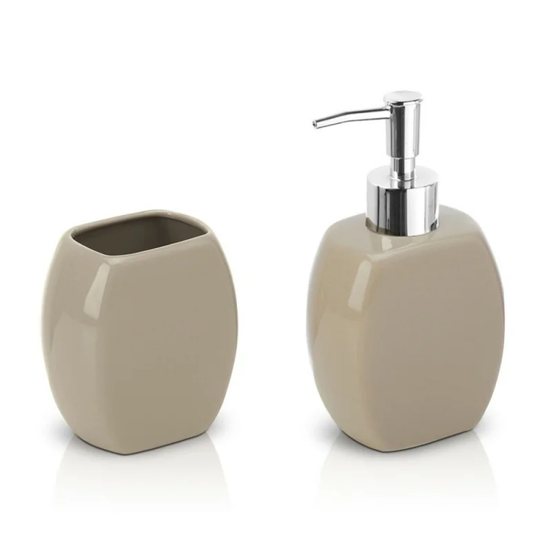 Set accessori bagno da appoggio dispenser e porta spazzolini in ceramica tortora