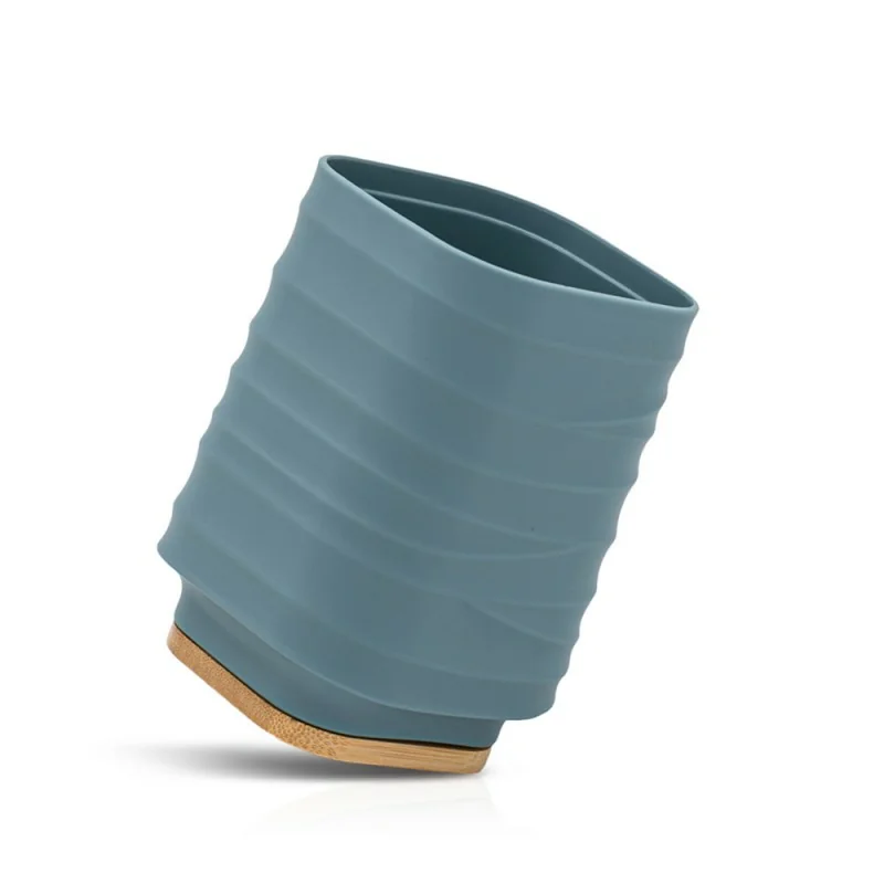 Set accessori bagno da appoggio dispenser e portaspazzolino turchese cobalto in abs e bambù linea Wave   Lasciati travolgere dalle forme...