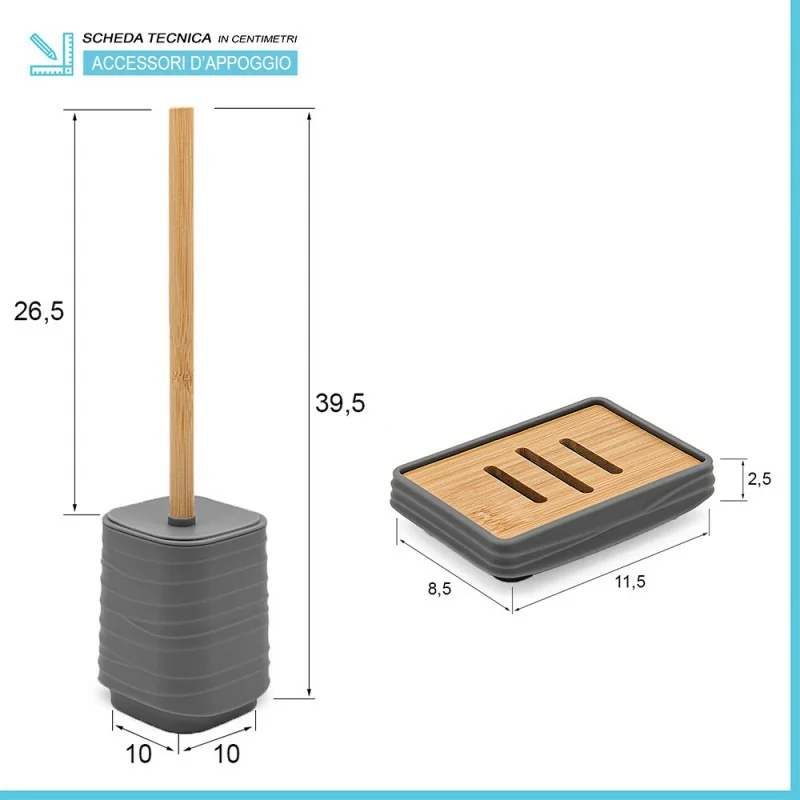 Accessori bagno – set completo con dispenser,portaspazzolini,porta sapone e scopino WC in abs grigio e bambù