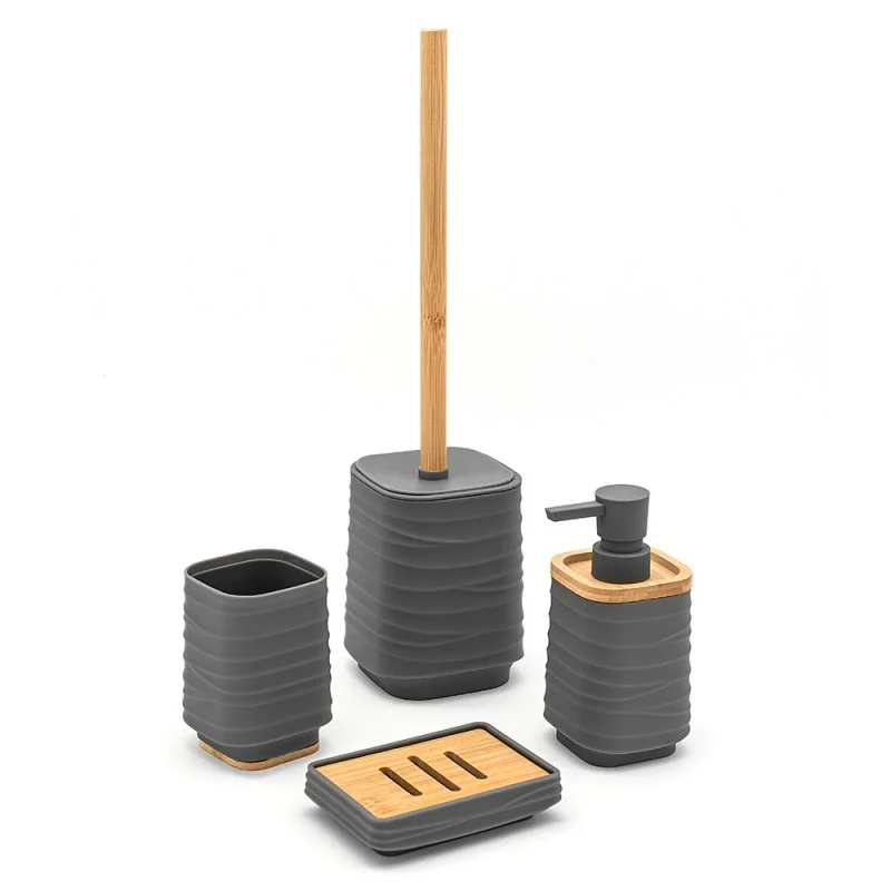 Set accessori bagno da appoggio – dispenser e portaspazzolino grigio in abs e bambù linea Wave