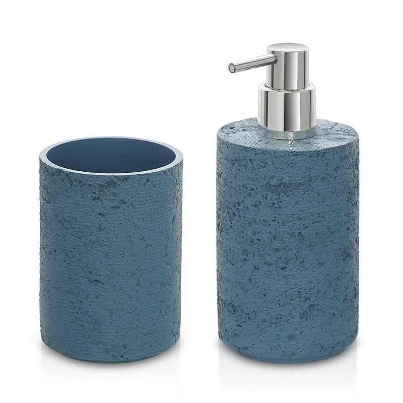 Set accessori bagno dispenser e portaspazzolini turchese cobalto resina effetto pietra Matera