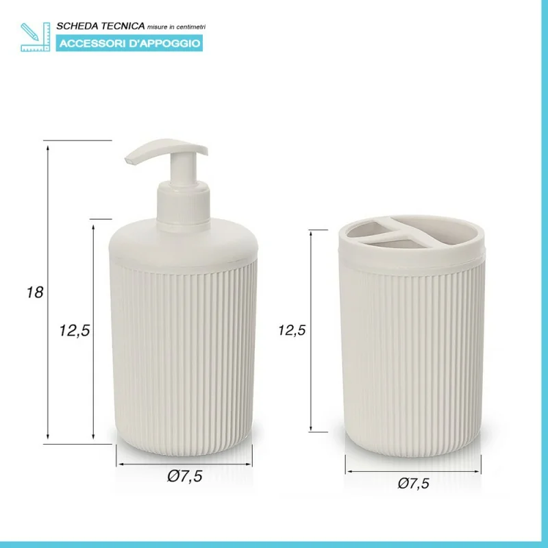 • Set composto da dispenser sapone,portaspazzolini,portasapone,portascopino e pattumiera;