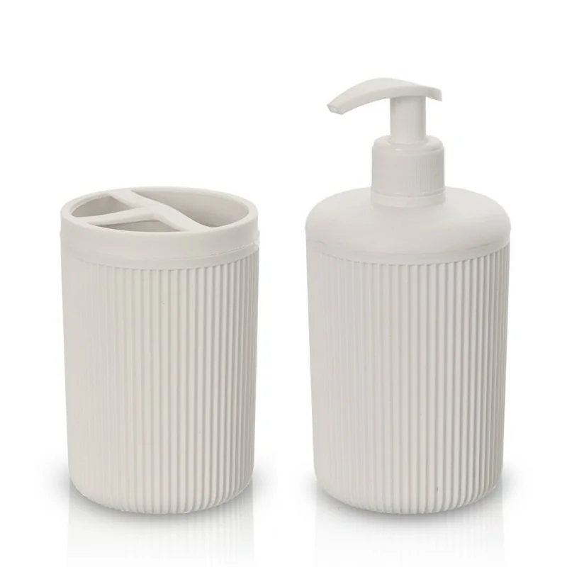 Set accessori bagno da appoggio – linea Ring dispenser e portaspazzolini beige in plastica