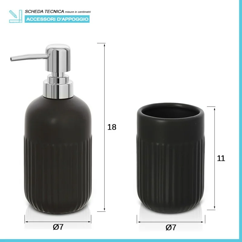 • Set composto da dispenser,portaspazzolini,portasapone e scopino;