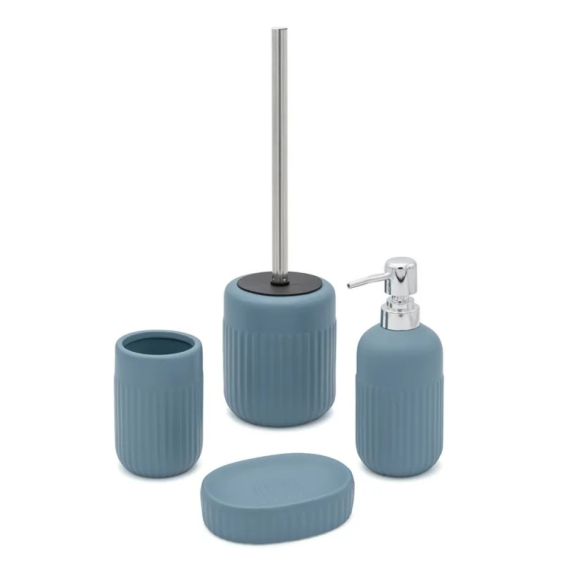 Il set accessori bagno 4 pezzi è completo di tutti i complementi utili all’arredo e all’igiene quotidiana personale e dell’ambiente bagno. È composto da un dispenser con capacità 280 ml, un piattino portasapone, bicchiere portaspazzolini ed un portascopino completo di scopino con manico in acciaio satinato.