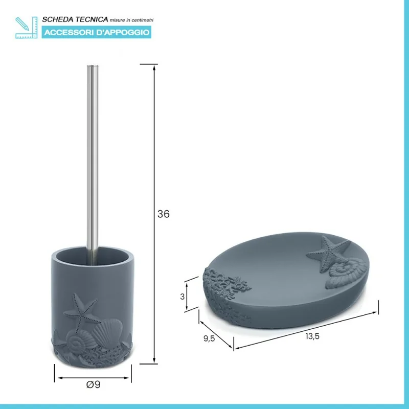 • Set:dispenser sapone,portaspazzolino,porta sapone e portascopino;