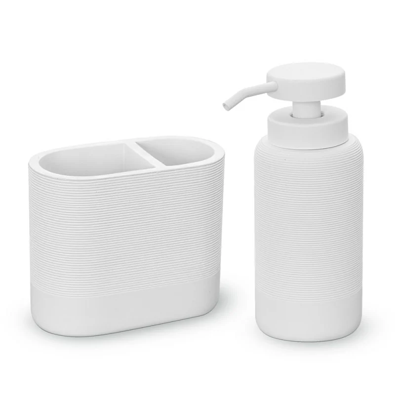 Set accessori bagno composto da dispenser sapone e porta spazzolino della linea Marica   Realizzata in  poliresina bianca  dal grip economico...