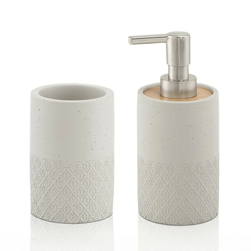 Kit bagno 2 pezzi con dosa sapone liquido e bicchiere porta spazzolino da appoggio grigio in cemento e bambù serie Afrodite   Un'armonia di...
