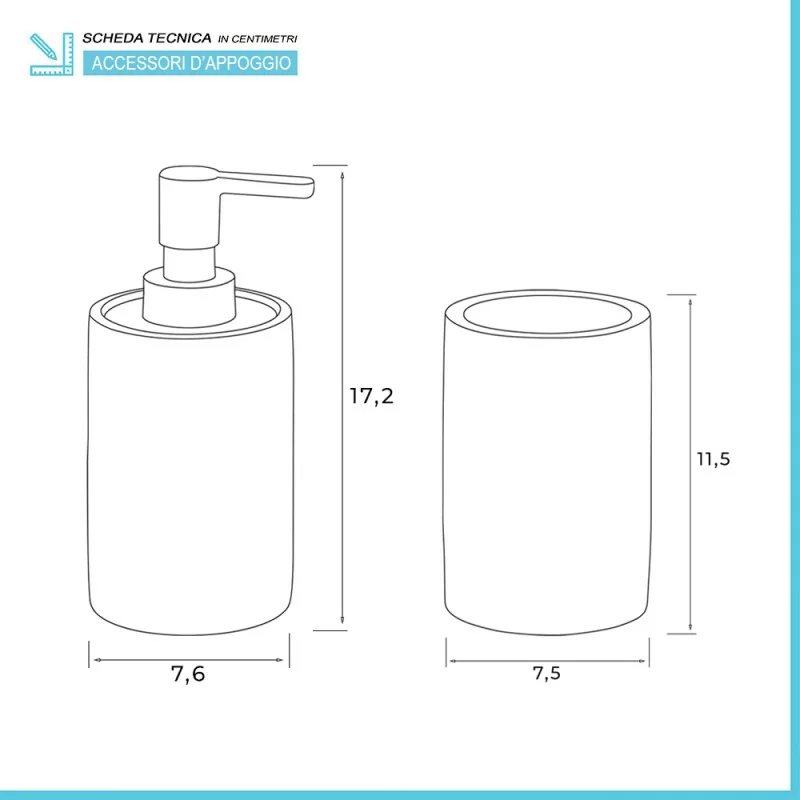 • Dimensioni Dispenser sapone: diametro 7,6 cm x H 17,2 cm;