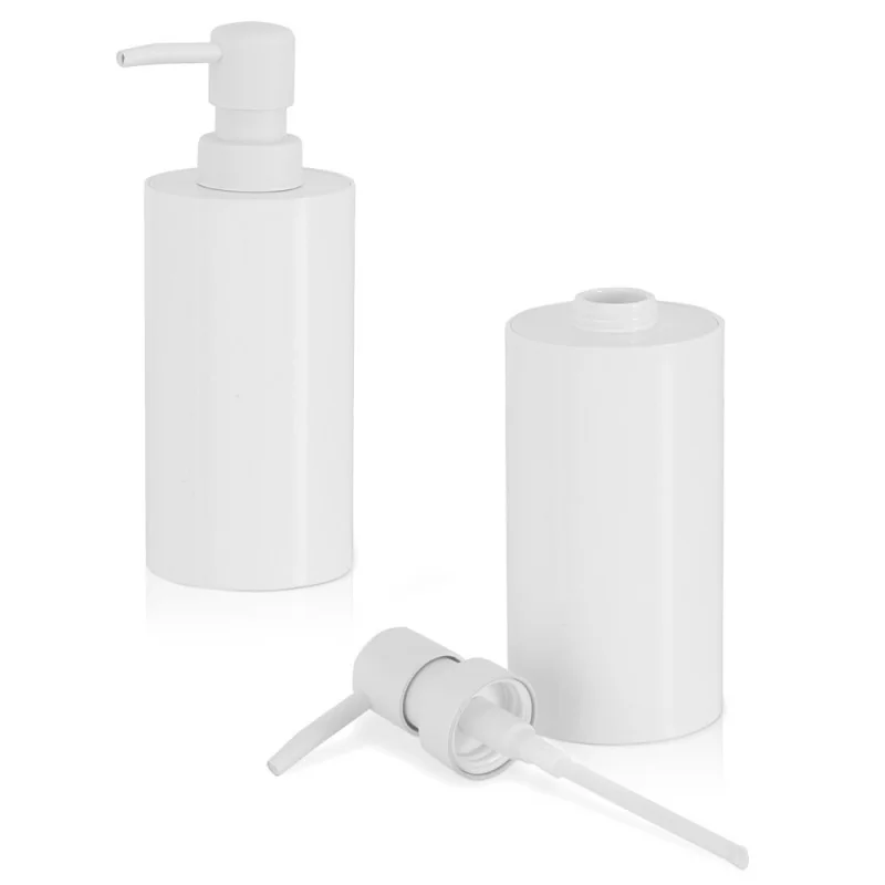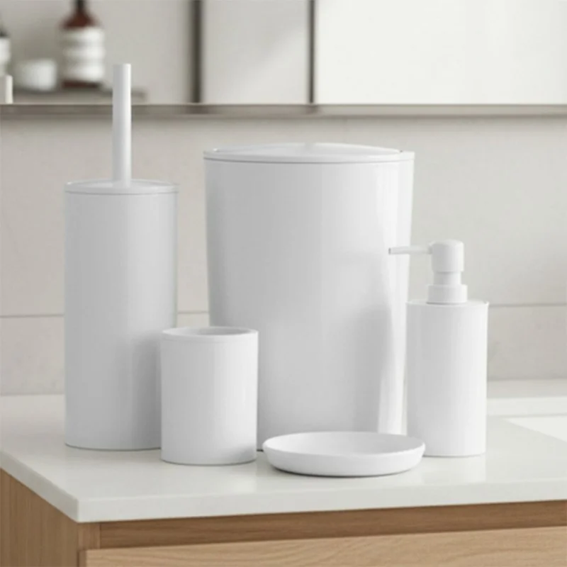 Realizzato in resistente termoplastica, il set da 5 pezzi in colore bianco comprende un dispenser per sapone liquido da 300 ml, un bicchiere portaspazzolini, un piattino portasapone, un portascopino e una pattumiera da 6 litri con coperchio basculante. Tutti gli elementi sono leggeri, facili da pulire e pensati per garantire ordine e armonia in ogni ambiente bagno.