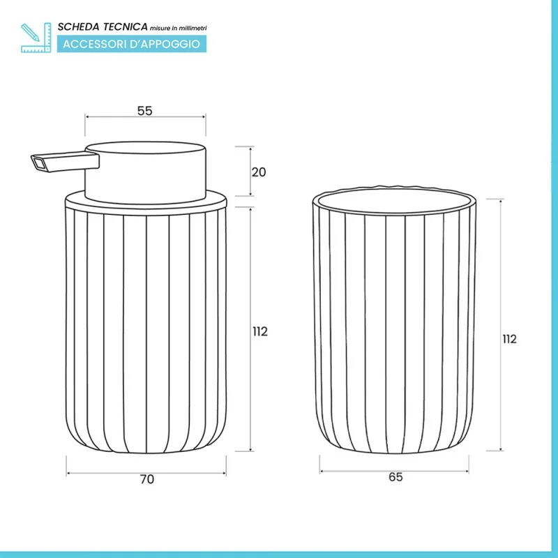 • Tipologia: Set accessori bagno da appoggio con dispenser sapone e portaspazzolino;