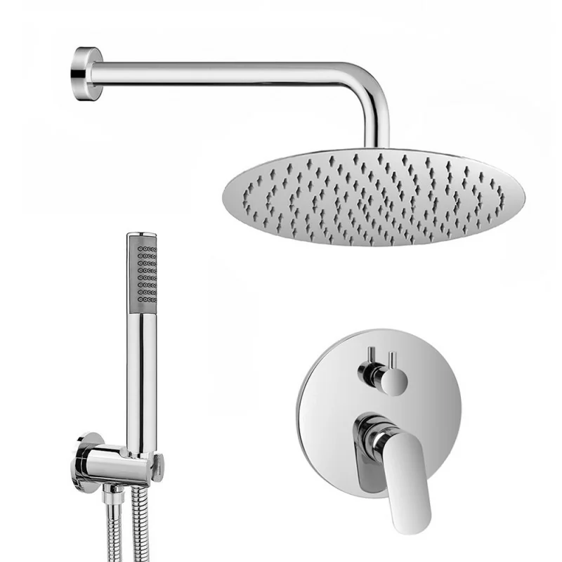Il set doccia tondo Kreo cromato è formato da un soffione tondo in Acciaio da 20 cm, un braccio doccia  tondo lungo 40 cm cromato,un miscelatore per doccia a incasso con deviatore e un kit dccia formato da doccia a singolo getto con presa d'acqua e flessibile.