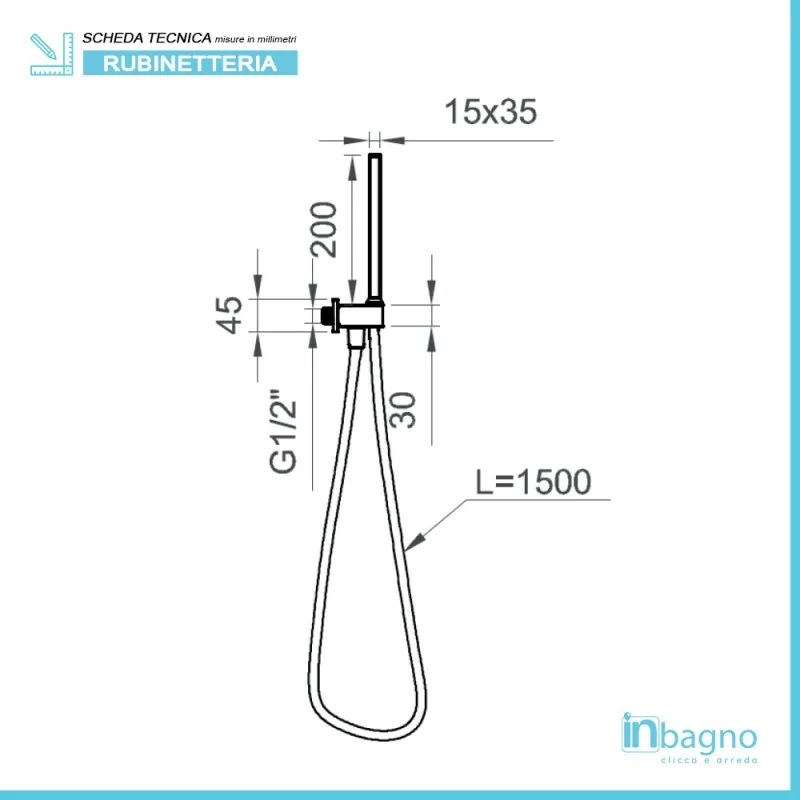 • Dimensioni doccetta:L 3,5 x H 20 cm,flessibile da 150 cm;