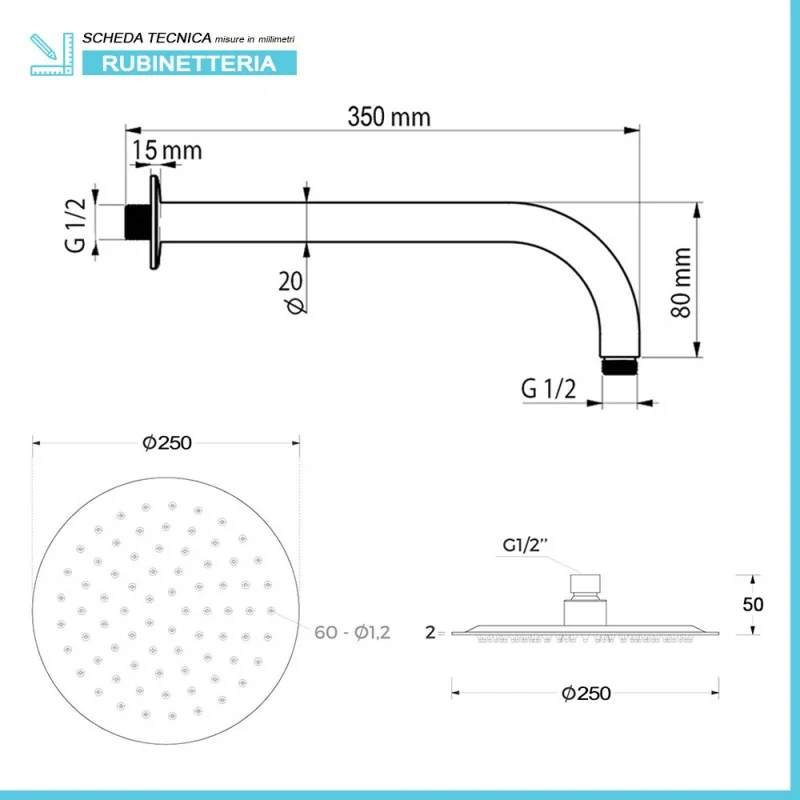 • Dimensioni soffione:diametro 25 cm x p 5 cm;ultra slim,spessore 2 mm;