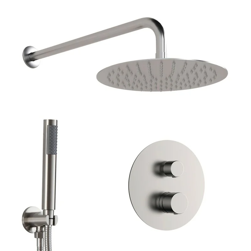 Il set Gemini include miscelatore doccia incasso con deviatore,braccio e soffione tondo con ugelli anticalcare,set con doccino in ottone,flessibile da 150 cm e presa acqua con supporto.