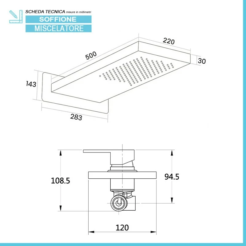 • Dimensioni soffione:L 22 x p 50 cm,spessore 3 cm;