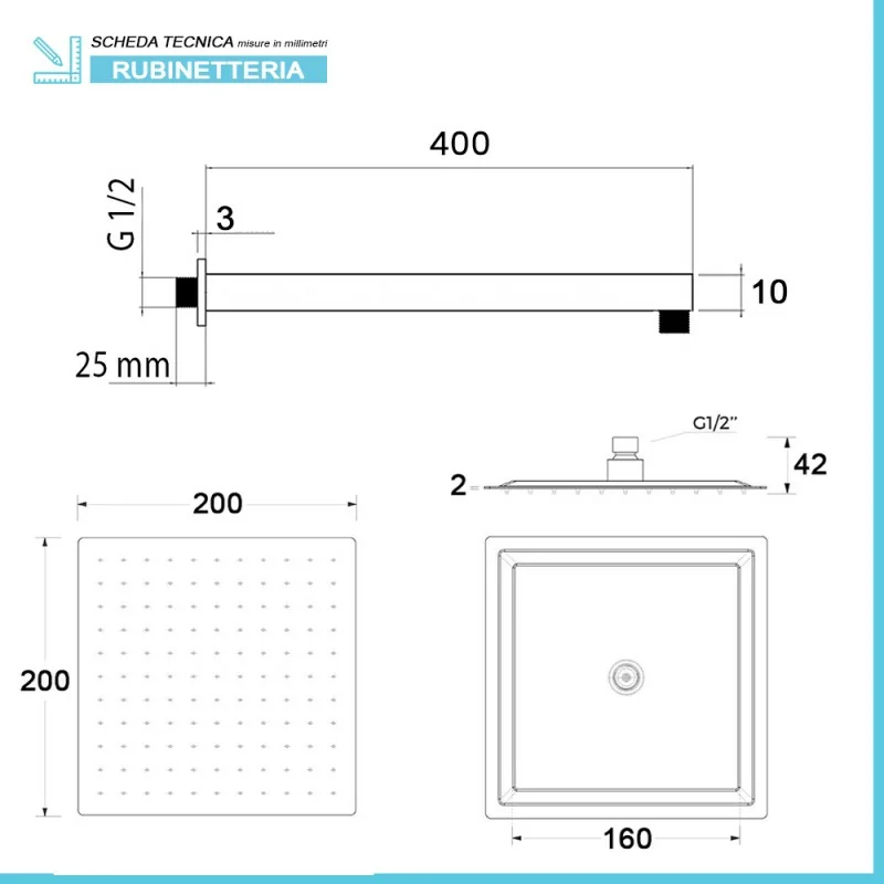 • Dimensioni soffione:L 20 x p 20 cm,spessore 2 mm;