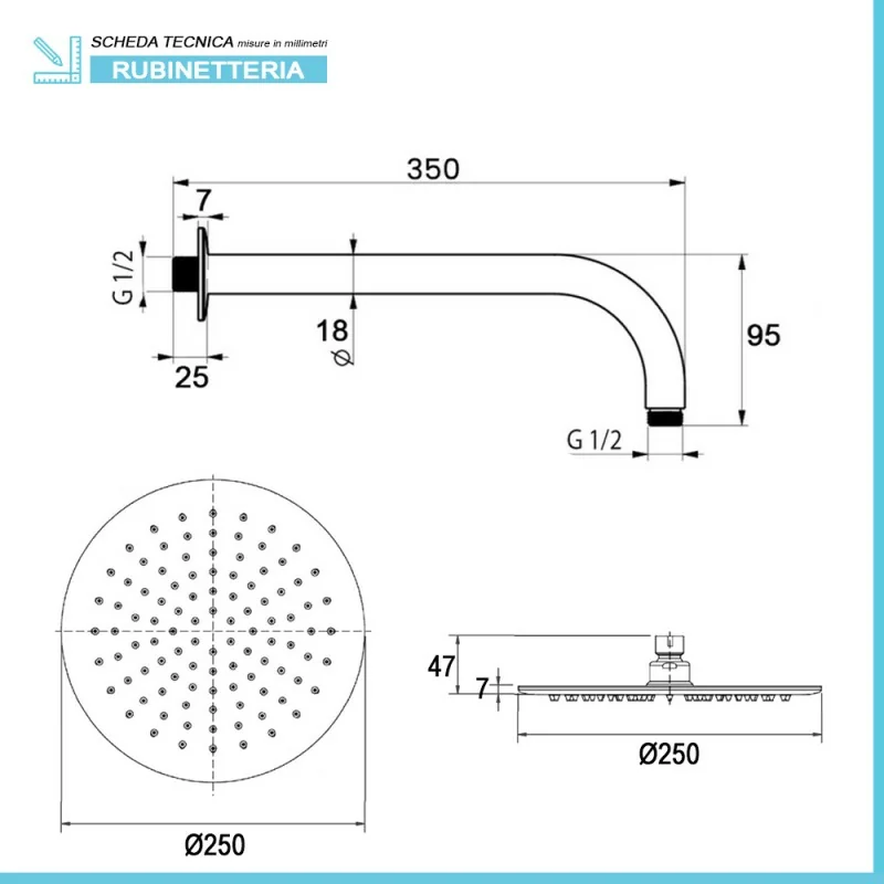 • Dimensioni soffione: diametro 25 cm x spessore 7 mm ultraslim;