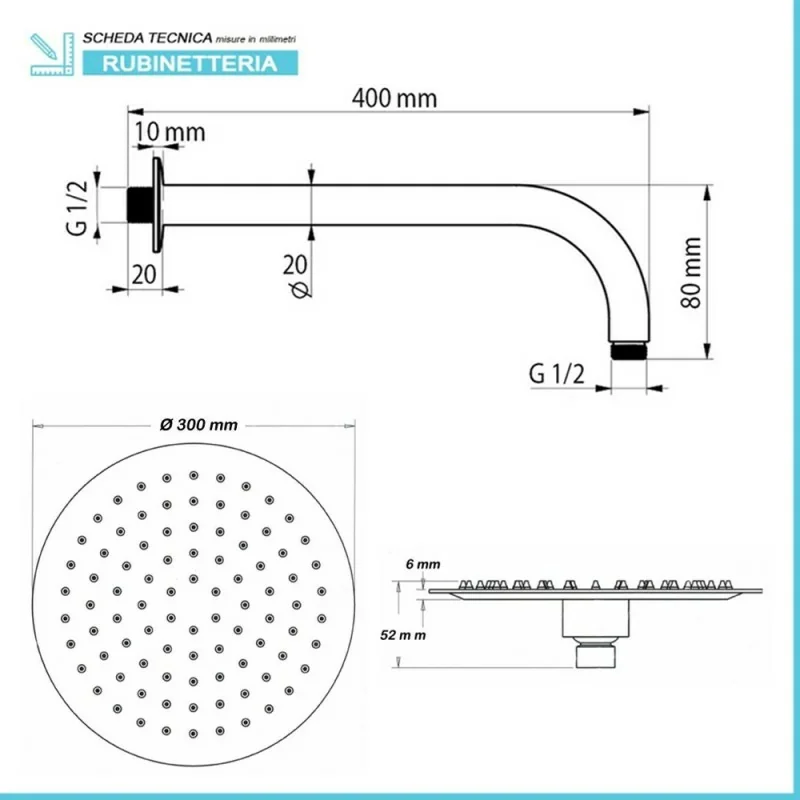 • Dimensioni soffione INOX: diametro 30 cm, spessore ultraslim 6 mm;