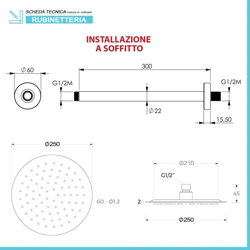 • Tipologia: braccio a soffitto, soffione doccia tondo e miscelatore ad incasso;