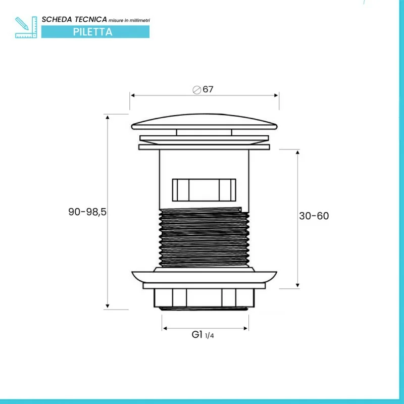 Piletta di scarico universale click clack con troppopieno tappo cromato Scheda tecnica Piletta di scarico universale click clack con troppopieno tappo cromato