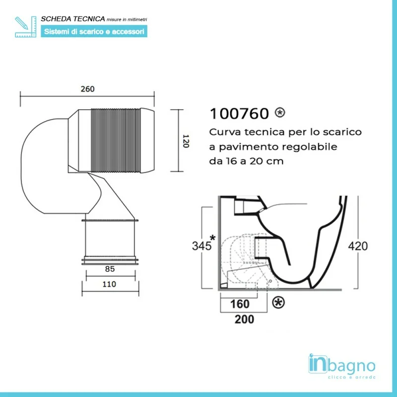 Curva tecnica per vaso traslato con scarico a terra da 16 a 25 cm Curva tecnica WC traslata da 16 a 25 cm Curva tecnica traslata con scarico a pavimento regolabile da 16 a 25 cm