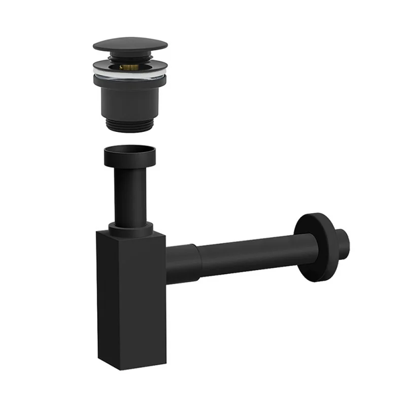 Sifone lavabo a canna quadrata nero opaco completo di piletta click clack