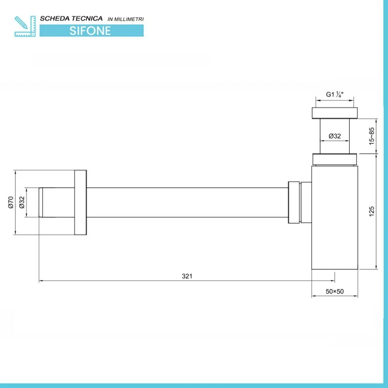 Sifone quadrato in ottone cromato 11/4 per lavabi d'appoggio o sospesi