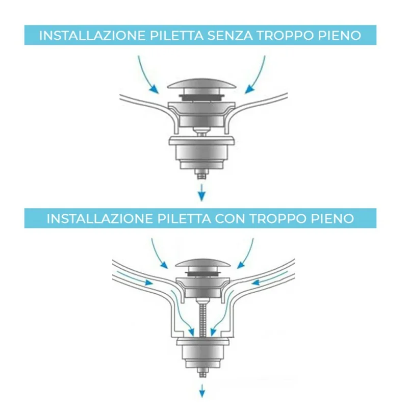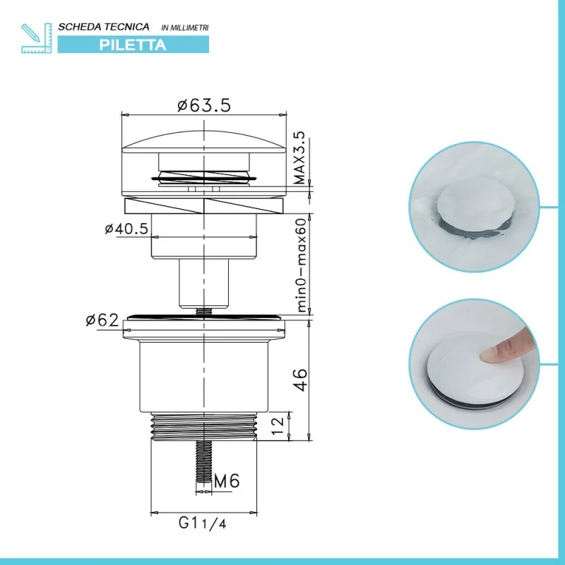 L’attacco standard G1”1/4 consente di sostituire la vecchia piletta o abbinarla ad un nuovo lavabo in maniera del tutto semplice e funzionale:pensata per offrire il massimo dell’utilità per i lavabi con o senza troppopieno,sarà sufficiente esercitare una leggera pressione sul tappo per uno scarico automatico.