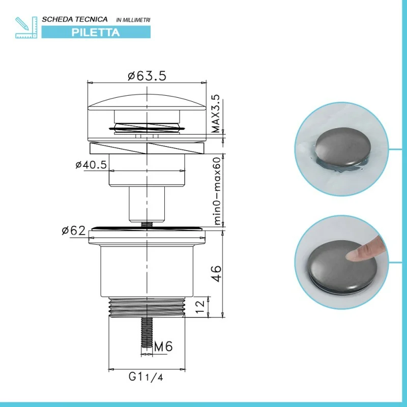 Piletta di scarico clic clac grigio opaca con e senza troppopieno Sistema di scarico click clack grigio opaca con e senza troppopieno Scheda tecnica Piletta di scarico clic clac grigio opaca con e senza troppopieno Foto su lavabo Piletta di scarico clic clac grigio opaca con e senza troppopieno Installazione Piletta di scarico clic clac grigio opaca con e senza troppopieno Composizione Piletta di scarico clic clac grigio opaca con e senza troppopieno