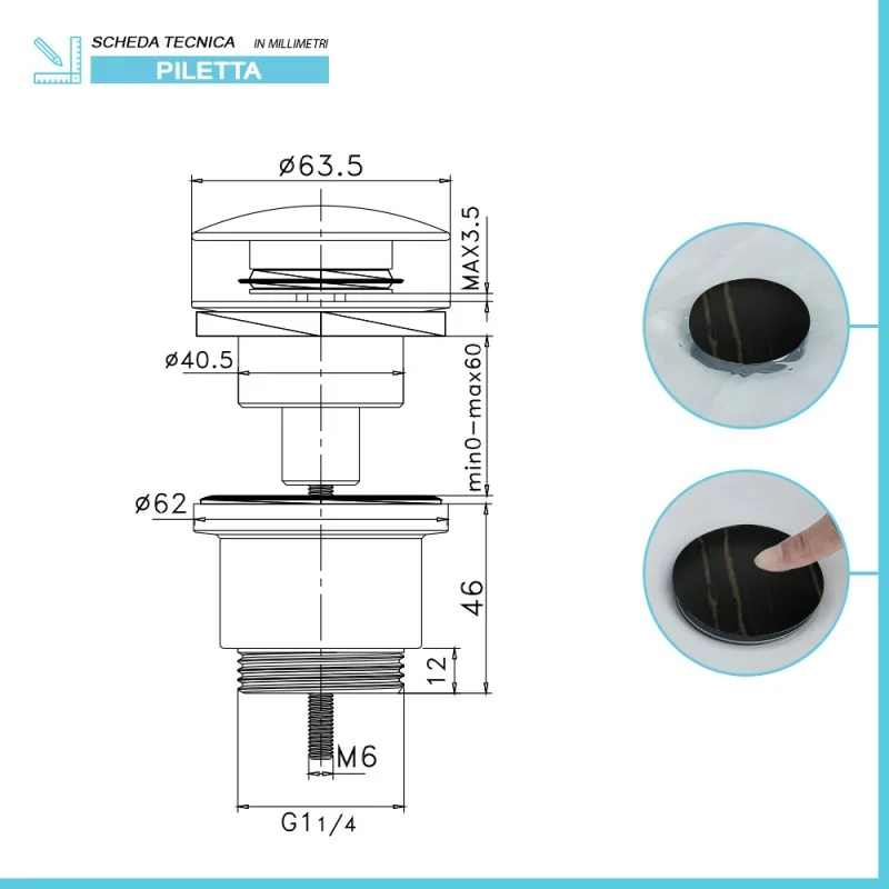 Piletta di scarico clic clac effetto marmo nero con e senza troppopieno Sistema di scarico click clack effetto marmo nero con e senza troppopieno Scheda tecnica Piletta di scarico clic clac effetto marmo nero con e senza troppopieno Foto su lavabo della piletta di scarico clic clac effetto marmo nero con e senza troppopieno Installazione Piletta di scarico clic clac effetto marmo nero con e senza troppopieno Composizione Piletta di scarico clic clac effetto marmo nero con e senza troppopieno